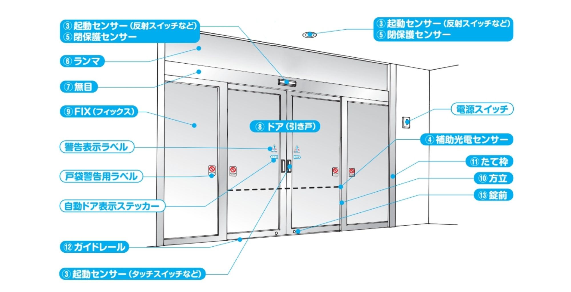 自動ドアのトラブルは主に以下の各部分の消耗・故障に起因することが多く、特に重点的なチェックが求められます。